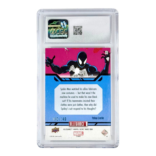 Spider Man 2024 Upper Deck Marvel Secret Wars 1984 Yellow Crackle 143/149 #89 CGC 9