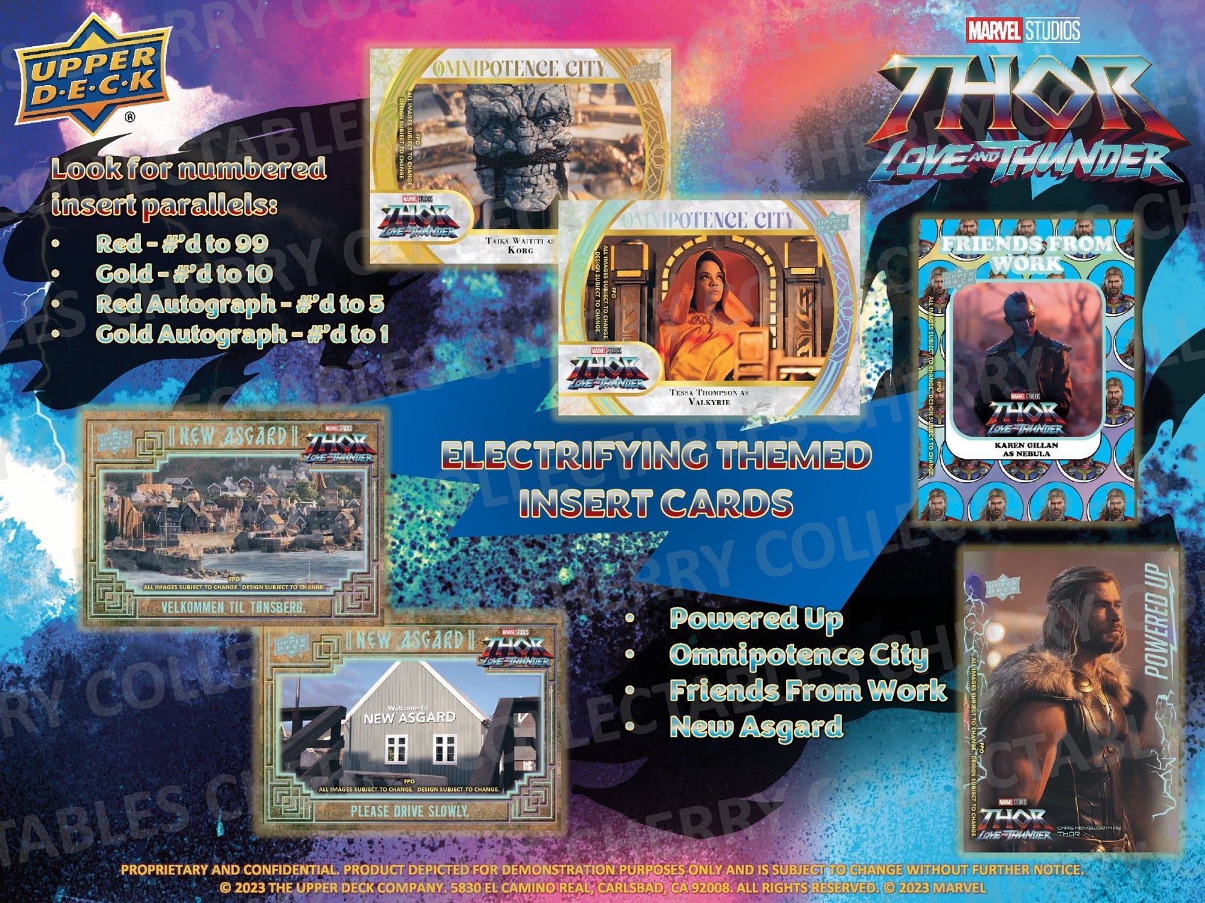 Discover the power of love and thunder in this exciting trading card set – Marvel Studios’ Thor Love and Thunder! Collect an 80-card Base Set along with themed insert cards, low-numbered parallel cards, acrylic cards, manufactured film cels, and talent autograph cards.