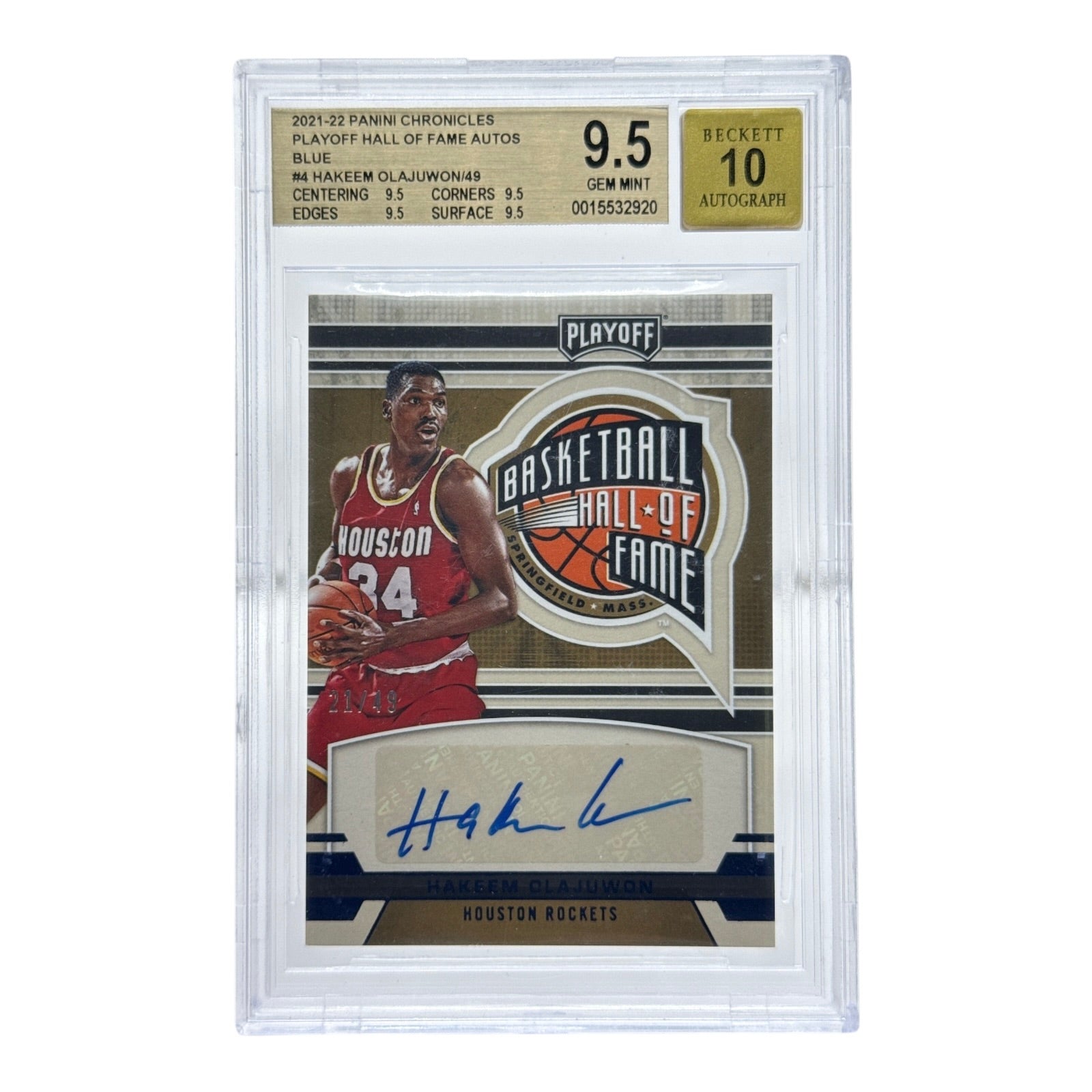 Hakeem Olajuwon 2021-22 Panini Chronicles Playoff Hall Of Fame Autos Blue 21/49 #4 BGS 9.5 Auto 10