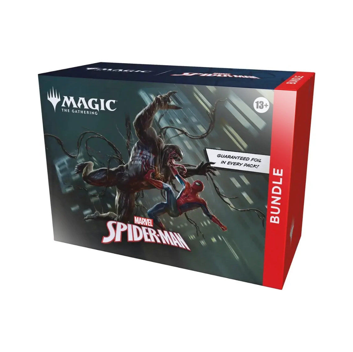 Gather web-slingers from across the Spider-Verse and team up to take down the sinister foes that threaten the city with a bundle full of cards and exclusive accessories. This Bundle contains 9 Magic: The Gathering | Marvel’s Spider-Man Play Boosters (each containing 14 cards), 1 Traditional Foil alternate-art promo card, 15 Traditional Foil Basic Land cards (including 5 with Full Art), 15 nonfoil Basic Land cards (5 with Full Art), 1 oversized Spindown life counter, 1 card storage box, and 2 reference cards.