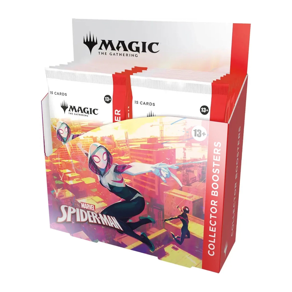 Suit up with the best spider-gear in any dimension! In this Collector Booster Box you’ll find 12 Magic: The Gathering | Marvel's Spider-Man Collector Boosters, each containing 15 Magic: The Gathering cards. Every pack contains 5 cards of rarity Rare or higher and 4 Uncommon, 5 Common, and 1 Full-Art Land cards, with a total of 11–13 Traditional Foil cards.