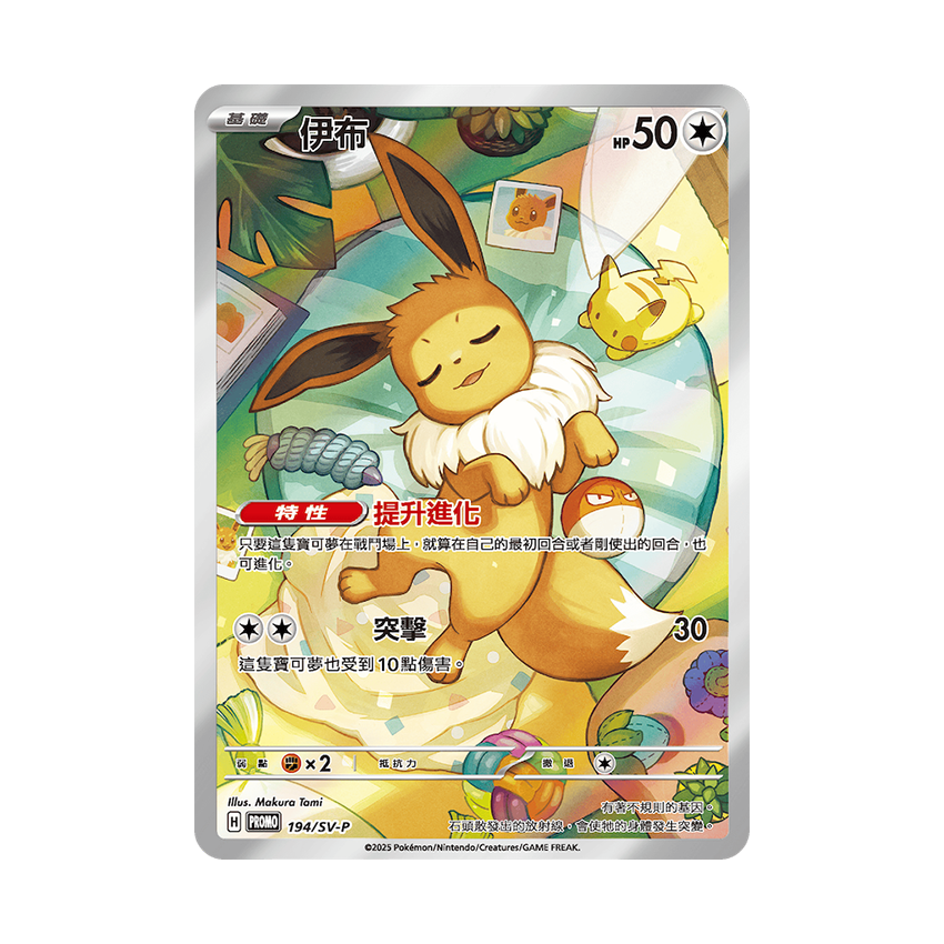 此組合中包含了高級擴充包「太晶慶典ex」5包、伊布家族設計的牌組卡套和牌組收納盒,以及可以放入你喜歡的寶可夢卡牌的卡牌鑰匙圈、特典卡。此組合中收錄的特典卡與高級擴充包「太晶慶典ex」中收錄的伊布不同,為全圖卡牌。躺著的伊布超級可愛。